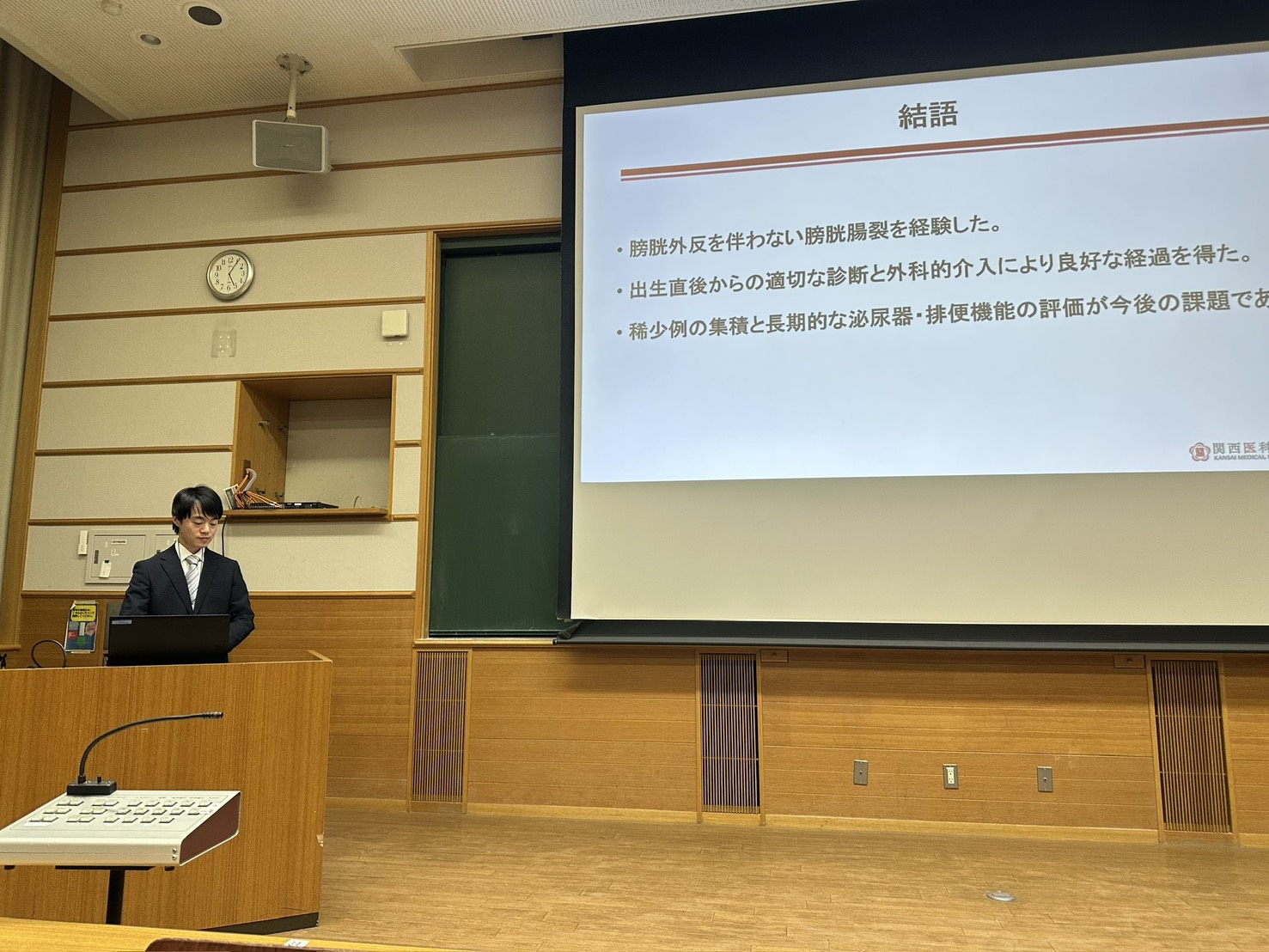 2025年11月29日に京都府立医科大学で開催された第35回近畿小児ストーマ・排泄・創傷研究会に参加してきました。当科からは、青木先生が研究発表を行いました。今回の発表を今後の診療や医療の発展に役立ててまいります。 新着情報 第41回日本小児外科学会秋季シンポジウムに参加してきました! 第38回日本内視鏡外科学会に参加してきました! 関連記事 病棟にサンタさんがやってきました! 2025年12月24日 第38回日本内視鏡外科学会に参加してきました! 2025年12月24日 第41回日本小児外科学会秋季シンポジウムに参加してきました! 2025年12月24日 ISPSR2025に参加してきました! 2025年12月4日 ホームページを公開しました 2025年11月11日
